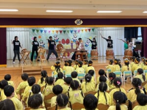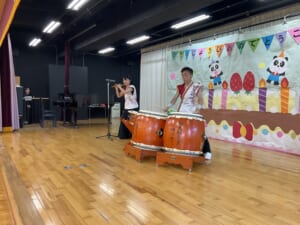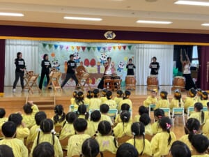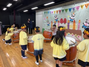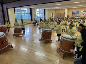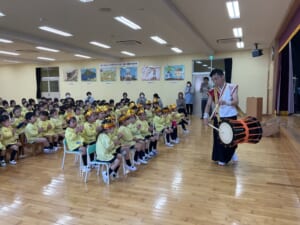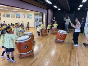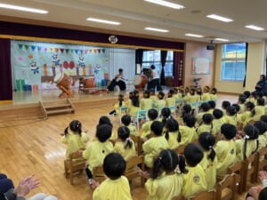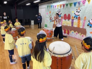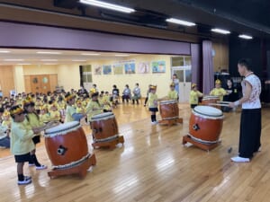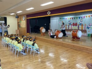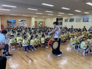 最初は大きな音にびっくりしていた子供たちも次第に太鼓のリズムに引き込まれていきました。