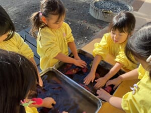 登園した順番に年長組と年中組がさつまいもを綺麗に洗いました。