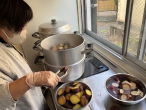 年少組、年中組が掘って来たさつまいものベニハルカ、そろそろ甘みが増した頃ということで、蒸しておやつにしました。