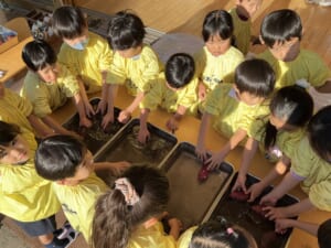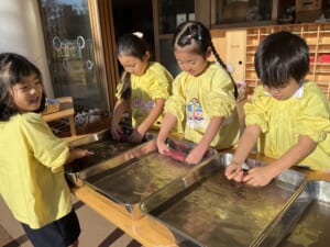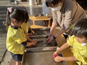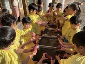 登園した順番に年長組と年中組がさつまいもを綺麗に洗いました。