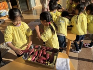 年少組、年中組が掘って来たさつまいものベニハルカ、そろそろ甘みが増した頃ということで、蒸しておやつにしました。