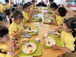 子どもたちの嬉しそうな様子です。給食の豚汁と一緒に、好きな味のお餅を選んで食べました。つきたてのお餅は美味しいね。