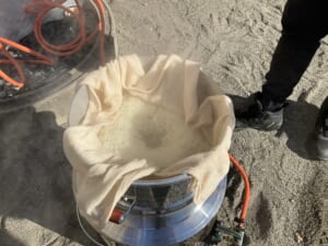 これがどんなふうに変化して行くのか良く見ていてね。最初はお父さんたちが腰を入れてこねます。
