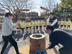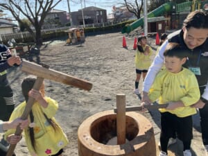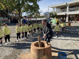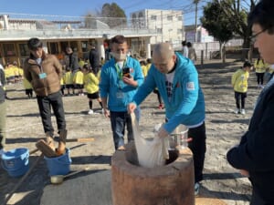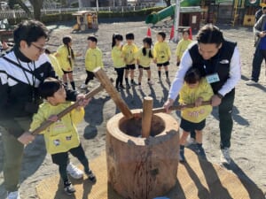 いよいよ子どもたちがつく番です。お父さんにお手伝いしてもらいながら、ひとり10回つきました。