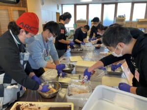 出来上がったお餅をお父さんたちが小さく千切って、味付けをしてくれました。