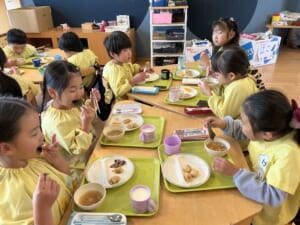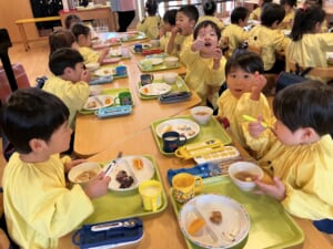 子どもたちの嬉しそうな様子です。給食の豚汁と一緒に、好きな味のお餅を選んで食べました。つきたてのお餅は美味しいね。