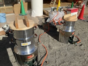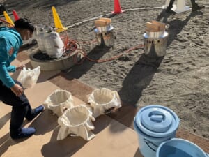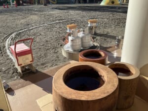 これがどんなふうに変化して行くのか良く見ていてね。最初はお父さんたちが腰を入れてこねます。