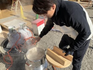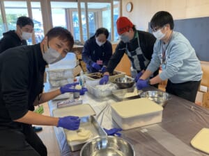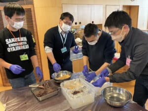 出来上がったお餅をお父さんたちが小さく千切って、味付けをしてくれました。