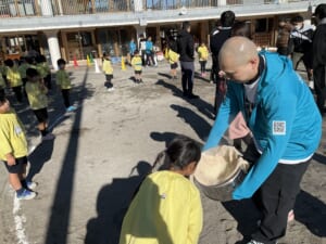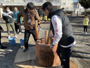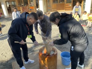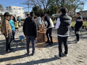 年末恒例の行事「もちつき」が行われました。寒い朝になりましたが、良く晴れて、冬の青空の下で、みんな頑張ってお餅をつく体験が出来ました。今年は例年以上におやじの会のお父さんたちの参加率が高く、大変助かりました。