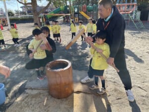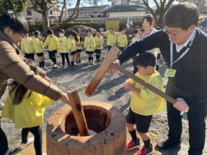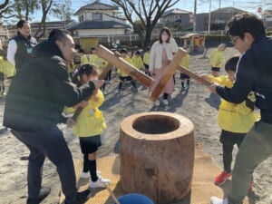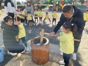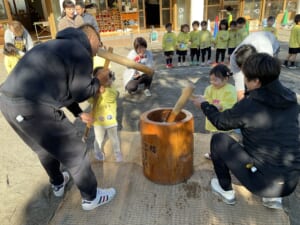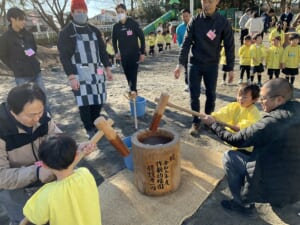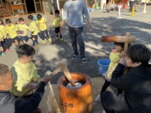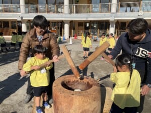 いよいよ子どもたちがつく番です。お父さんにお手伝いしてもらいながら、ひとり10回つきました。