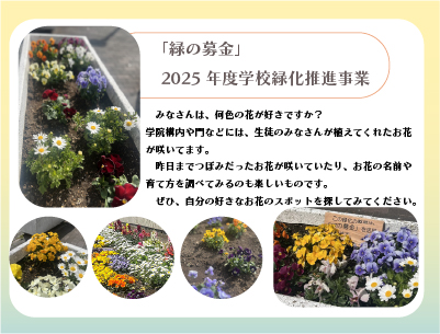 作新 お気に入りスポット探してみよう~「緑の募金」2025年度学校緑化推進事業 投稿日:2025年12月10日 みなさんは、何色の花が好きですか? 作新学院は、幼稚園児から高校生までが一つのキャンパスに集っており、構内には、四季折々の植物が学院を彩っています。 2025年度学校緑化推進事業として、今年も「緑の募金」を活用し、校内の緑化を整備させていただきました。生徒のみなさんが植えてくれたお花が咲いています。 昨日までつぼみだった花が咲いていたり、寒そうに凍えているパンジーが元気よく咲いていたりします。お花の名前や育て方を調べるのも楽しいです! ぜひ、お気に入りのスポットを探してみてください。