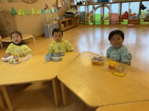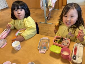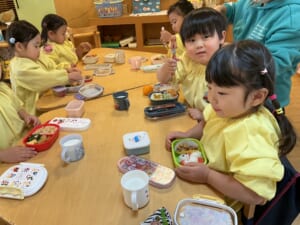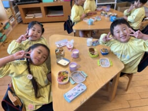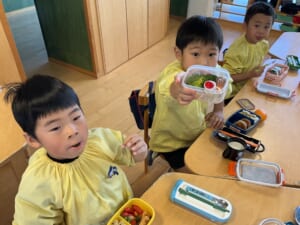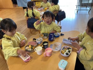 おいしい、たのしい、うれしいが食育の基本。みんなお家の方の愛情たっぷりのお弁当を食べて、お腹も心も満たされて、大きくなあれ!