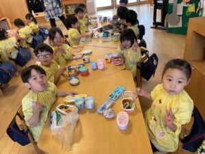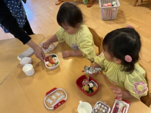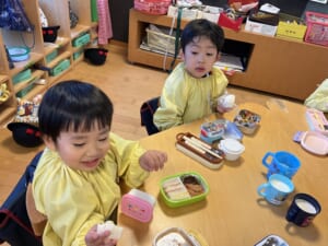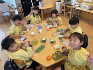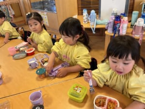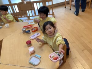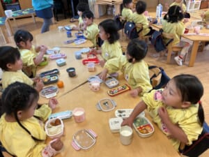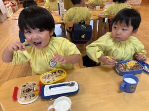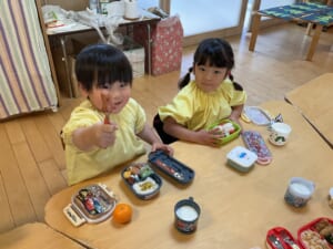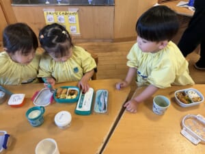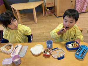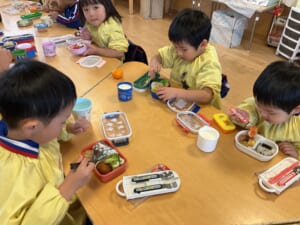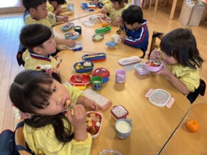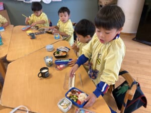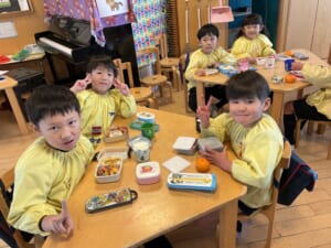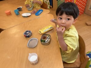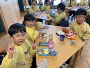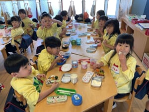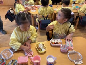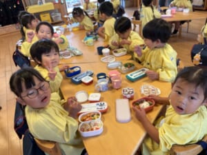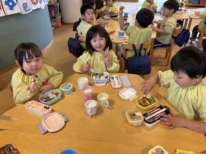 おいしい、たのしい、うれしいが食育の基本。みんなお家の方の愛情たっぷりのお弁当を食べて、お腹も心も満たされて、大きくなあれ!
