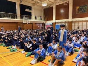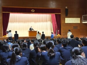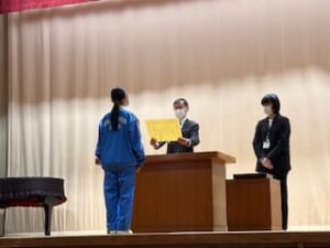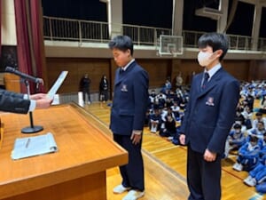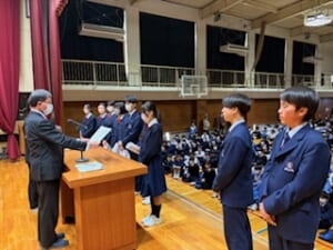 バスケットボール1年生大会予選リーグ全勝突破、兵庫県で行われる科学の甲子園全国大会に出場するメンバーなどが指名されマイクを向けられると代表生徒が挨拶し会場は盛りあがりました。