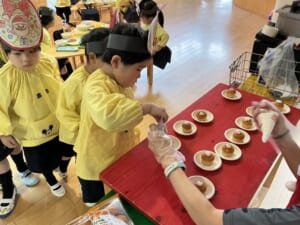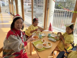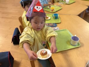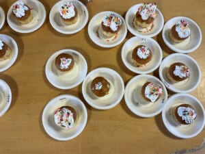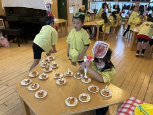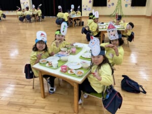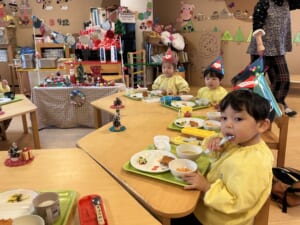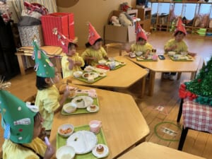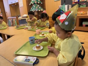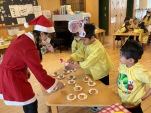 クリスマス会の日のランチは学年ごとにみんなで食べました。今年はプチケーキを自分でトッピングして作りました。