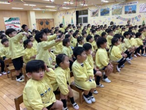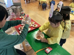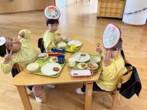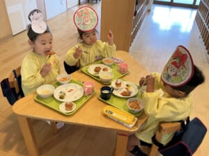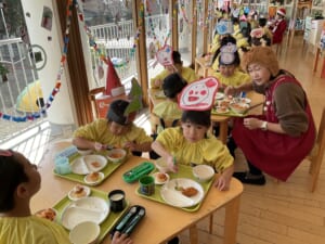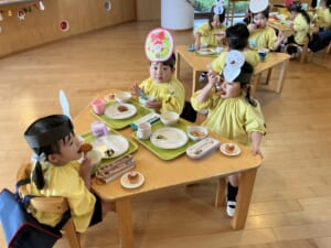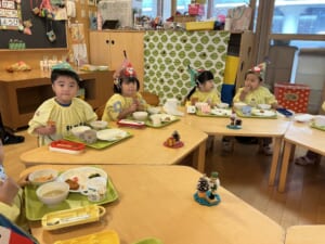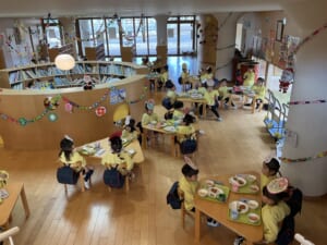 年少組は絵本コーナー、年中組はプレイ室、年長組は2階の廊下で食べました。