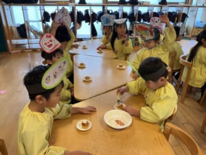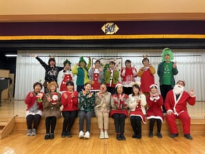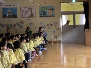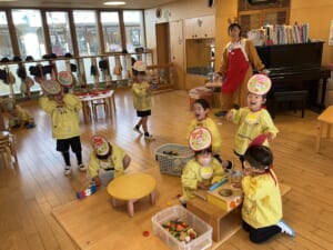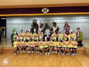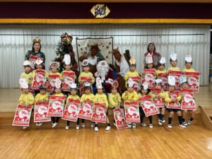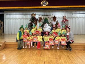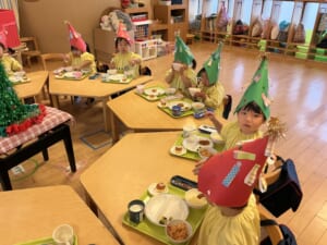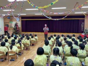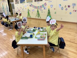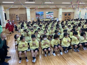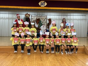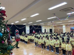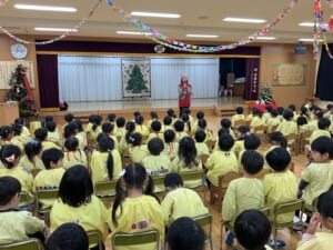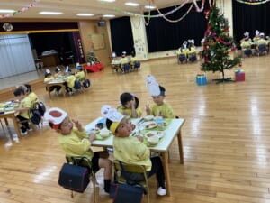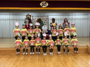 2学期の終業式を2日後に控えて、幼稚園ではちょっと早めのクリスマス会が開かれました。園児たちはプレイ室や絵本コーナーをクリスマスらしく飾りつけてこの日を楽しみにして来ました。自分たちで作った思い思いのお面や帽子を持って、プレイ室に集合です。