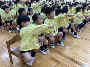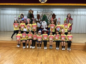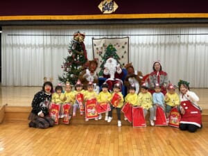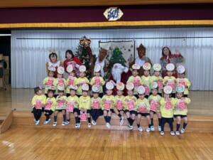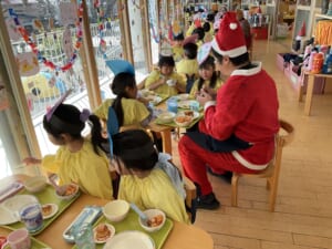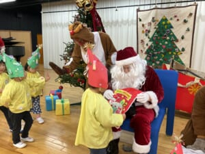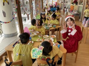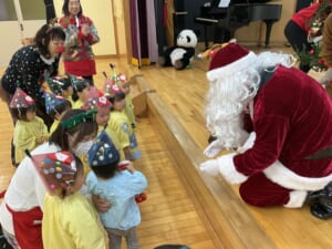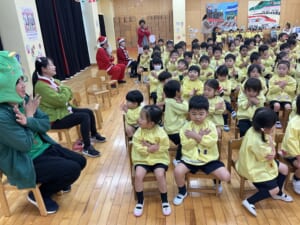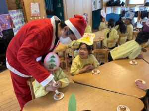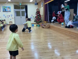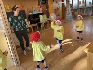 登園して来た子どもたち。朝からテンションあげあげです。先生たちもノリノリのクリスマスバージョンで子どもたちを盛り上げます。