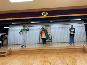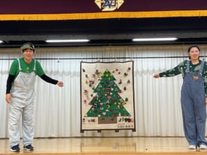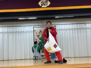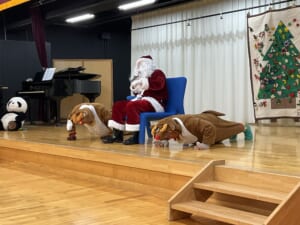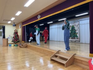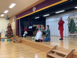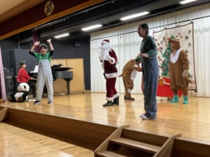 先生方によるクリスマス劇。サンタの格好の泥棒が幼稚園の大事なものを盗んでしまいます。会場の子どもたちは真剣に大きな声でどろぼうの居場所を指さします。