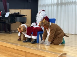 トナカイさんも一緒です。サンタさんに幾つかの質問をして答えてもらいました。トナカイさんの体力作りも見せてくれました。