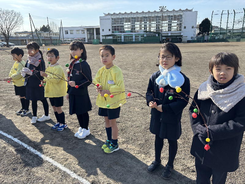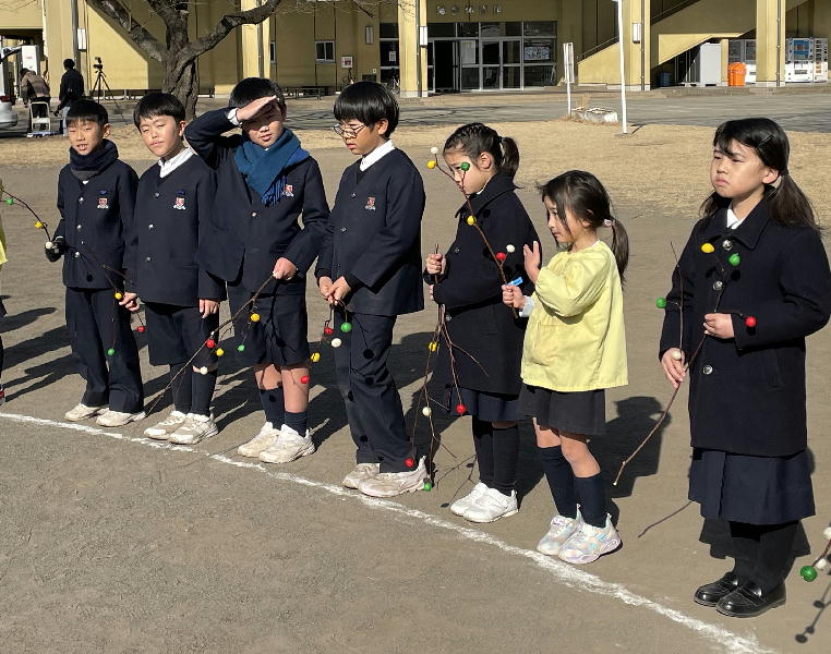 小学 どんどやき(3年) 投稿日:2026年1月16日 作新学院幼稚園の年長さんといっしょにどんど焼きを体験しました。どんど焼きは,お正月に使ったしめ縄やお守りなどを集めて焼き,その火にあたることで一年の無病息災や家内安全を願う,日本に古くから伝わる行事です。 どんど焼きに使うまゆ玉は、前日に3年生が心を込めて準備しました。年長さんといっしょにどんど焼きの火にまゆ玉の枝をかざし,1年の健康をお祈りしました。 交流を楽しみながら,年中行事の意義も学ぶことができました。 ダウンロード