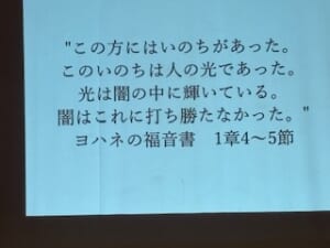イギリスでは冬になると10人に1人が冬季うつ病になるといわれています。それは、日照不足によってセロトニンが不足することや寝不足によるものだそうです。治療法としては強い光を一定時間浴びるなど”光”が大切です。 光は肉体だけでなく心にも必要なのです。例えば「希望の光」なんかもそうです。第二次世界大戦中600万人のユダヤ人が収容所という絶望の中で過ごしましたが、希望を持ってた人だけが最後の最後まで生き延びたという話があります。皆さんにも将来の夢や希望の光が満ちているか。遠い過去から現在まで聖書には読んだ人に希望を与えてきました。スポーツ選手、アーティスト、たくさんの人たちが聖書によって希望の光を与えてもらいました。