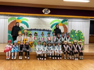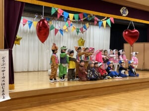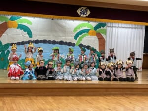 子どもたちが南の島の動物たちに変身して演じます。ワニに食べられそうになった象を動物たちが必死に引っ張ったから伸びちゃったという結末で楽しく見ることが出来ました。