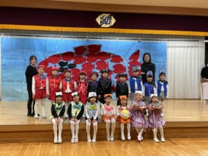 作新学院幼稚園のこども劇場は衣装、大道具、小道具全てが手作りで、演奏もCDは一切使いません。全てピアノの生演奏で、教員の陰の努力も並大抵ではありませんが、子どもたちの達成感のために毎年頑張っています。