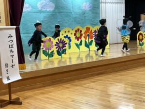 小さな昆虫に扮した子供たち。みんな、みんな生きているんだ、友達なんだをテーマに昆虫の特徴を捉えた見事な演技を見せてくれました。