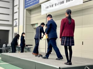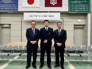 2月25日(水)、宇都宮市役所にて開催された、宮っ子表彰表彰式に行ってきました。60名あまりの受賞者のうち、中等部からは、バスケットボール部部長も担ってくれた尾股宗将さんが参加しました。主催者である宇都宮市長、宇都宮市教育委員会教育長から、本人の9年間に及ぶ努力の成果を称え、ご家族をはじめ関わった方々への感謝の大切さ、今後も自信と誇りをもって人間力を磨いていって欲しいとのエールをいただきました。また、来賓を代表して宇都宮市議会議長から、お褒めの言葉と保護者の皆様への労い、宇都宮市の宝である生徒の皆さんへの励ましの言葉などをいただきました。学院長とともに参加しましたが、尾股さんの受賞の様子はとても誇らしく感じました。その様子の一端を紹介いたします。