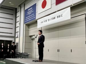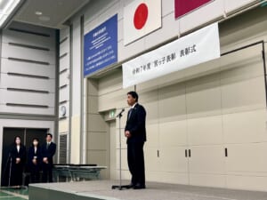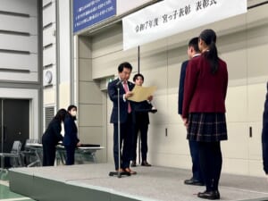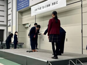 2月25日(水)、宇都宮市役所にて開催された、宮っ子表彰表彰式に行ってきました。60名あまりの受賞者のうち、中等部からは、バスケットボール部部長も担ってくれた尾股宗将さんが参加しました。主催者である宇都宮市長、宇都宮市教育委員会教育長から、本人の9年間に及ぶ努力の成果を称え、ご家族をはじめ関わった方々への感謝の大切さ、今後も自信と誇りをもって人間力を磨いていって欲しいとのエールをいただきました。また、来賓を代表して宇都宮市議会議長から、お褒めの言葉と保護者の皆様への労い、宇都宮市の宝である生徒の皆さんへの励ましの言葉などをいただきました。学院長とともに参加しましたが、尾股さんの受賞の様子はとても誇らしく感じました。その様子の一端を紹介いたします。