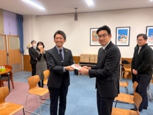 その第1回目の贈呈式が、今回の野球部全国優勝です。保護者会から川井会長、矢部副会長の2名、野球部保護者会から荒田・松本新旧会長の2名、中等部から中等部長、教頭、野球部顧問の増渕監督、川野部長の4名が出席しました。改めて、今後の選手の皆さんの活躍に期待するとともに、支えていただいている関係者の皆様に感謝申し上げます。今後も変わらぬご支援をよろしくお願いいたします。