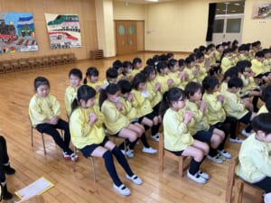朝のお祈りと讃美歌。今月の歌は「うれしいひな祭り」でした。