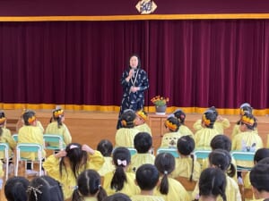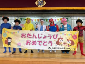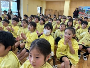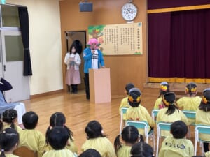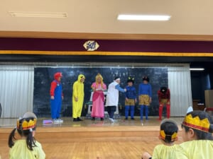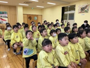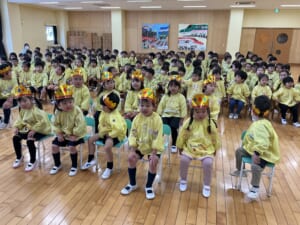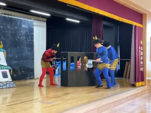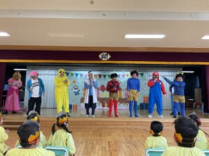 第二部は毎年恒例になった「おやじ劇場」保護者会四役さんと年長組のお父さんの有志で、楽しいモモタロウの劇を見せてくれました。なんと!ノーBGMで迫真の演技。子どもたちも笑ったり、鬼に驚いて泣いたり、劇に引き込まれていました。