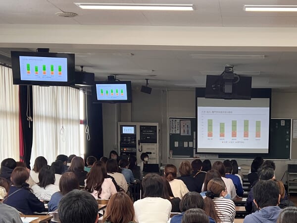 情科 進路を知る、確かな一歩へ「学年学科別保護者会」 投稿日:2026年4月18日 4月18日(土)本校にて、情報科学部学年・学科別保護者会を開催いたしました。当日は、各学年・学科ごとに教育方針や指導内容について詳しくご説明させていただきました。日頃の教育活動のねらいや、生徒一人ひとりの成長を支える取り組みについてご理解を深めていただけたことと思います。また、進学・就職状況についても、具体的なデータを交えながらご報告いたしました。近年の動向や本校の実績を共有することで、今後の進路選択に向けた一助となれば幸いです。ご来校いただきました保護者の皆様に、心より御礼申し上げます。 進学・就職指導委員会