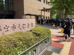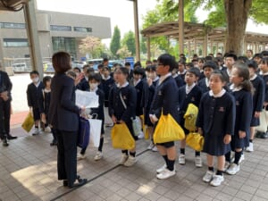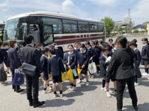 学院バスで文化会館に到着。先生から観劇する際の注意点などのお話を聞き、会場に入る児童たち。