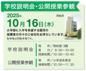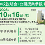 今年度の小学部の学校説明会・公開授業参観を次の通り行います。 【日 時】:令和7年10月16日(木) 《学校説明会》 ・開催時間:10:00~10:40 (受付9:30~) ・会場 :聴蛙館(ちょうあかん)3階ホー ...