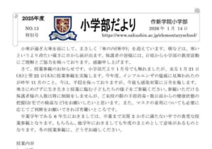 授業参観を下記の日程で行います。寒さに負けず元気に学びに臨む子どもたちの姿をどうぞご覧ください。 【日時】令和8年1月21日(水),22日(木) 2時限目(9:55~10:40) ※1~4年生の保護者の方は第1校舎児童 ...