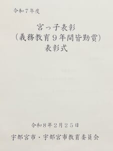 2月25日(水)、宇都宮市役所にて開催された、宮っ子表彰表彰式に行ってきました。60名あまりの受賞者のうち、中等部からは、バスケットボール部部長も担ってくれた尾股宗将さんが参加しました。主催者である宇都宮市長、宇都宮市教 ...