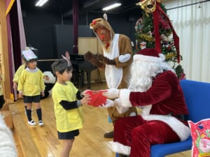 2学期の終業式を2日後に控えて、幼稚園ではちょっと早めのクリスマス会が開かれました。園児たちはプレイ室や絵本コーナーをクリスマスらしく飾りつけてこの日を楽しみにして来ました。自分たちで作った思い思いのお面や帽子を持って、 ...